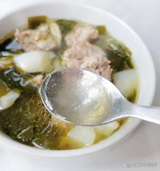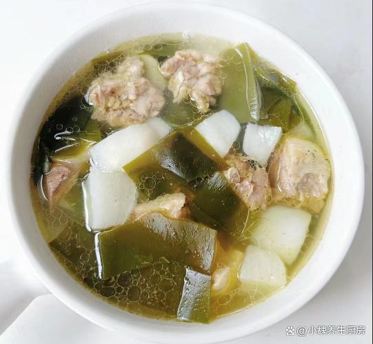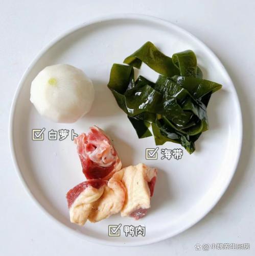转眼之间,十月马上要过完了,11月就要来临了,秋天要落下帷幕,冬天要来临了,目前处于秋冬交替的日子,冷空气来袭,气温会快速降低,身体储存大量的湿毒,身体会不舒服。许多广东人研究出一些养生的食疗方,秋冬正是萝卜上市的季节,拿来煲汤非常合适,可以搭配海带和老鸭煲汤,祛湿健脾,补充营养,让你舒服度过冬天。许多人肯定没有喝过这款海带白萝卜老鸭汤,赶快收藏起来,学会受益一生!11月,有钱没钱,常给家人喝这汤,营养易消化,舒服度过冬天。  【海带白萝卜老鸭汤的正确做法】 选购食材:选购300克白萝卜(白萝卜是平价的蔬菜,秋冬季节正当季,萝卜吃起来非常清甜,能够制作成各种美食,拿来炖汤喝很不错),选购干海带50克(干海带是最便宜的海鲜,非常容易储存,泡发后就可以煲汤,海带汤的钙铁含量高,营养很容易消化和吸收,孩子一定要多吃海带),少许温水和清水,若干根香葱,生姜一大块,面粉少许,食盐和胡椒粉若干,料酒少许,选购半只老鸭,其他佐料。 具体制作步骤: 第一步:提前准备好老鸭,海带和白萝卜,先把香葱洗净打成葱结,生姜洗净切成若干薄片,备用。 第二步:将海带放在容器里,加上适量温水泡发,用剪刀去掉根蒂,洗净切成小方块,控干水分备用。 第三步:白萝卜去皮洗干净,切成若干小块,老鸭提前处理干净,去掉内脏和多余部位,剁成一些块状,鸭肉用清水冲洗几遍。 第四步:鸭肉放在容器里,加上适量面粉,用手反复搓洗干净,吸附掉一些血腥物质,锅中加上冷水,倒入一些鸭肉,放入葱结和姜片,调入一丢丢料酒,将鸭肉焯烫处理,捞出用温水冲洗掉浮沫。