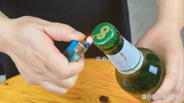 大概烧上十几秒钟,瓶盖被烧热了之后,我们再用纸巾包裹住瓶盖,然后稍微用力一揭,啤酒也就被打开了。这个方法利用的就是一个热胀冷缩的原理,因为啤酒中是有很多气体的,当里面的气体受热后就会膨胀。在压力的作用下,瓶盖就能轻松被打开了。