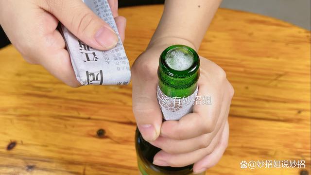 接下来,我们只需要将手握住瓶口下方一点的位置,然后将纸张的尖角对准瓶盖,用力一撬,这样瓶盖也轻松打开了。