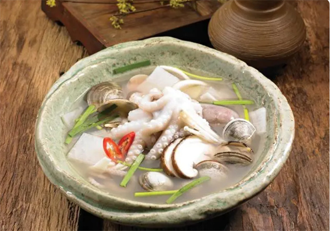 二、制作步骤: 1. 炖制排骨汤底: 将排骨放入锅中,加足够的水,煮沸后撇去浮沫。然后将火调小,继续炖煮30分钟左右,以便排骨的营养充分释放出来。 2. 加入墨鱼: 将清洗干净的墨鱼片加入锅中,继续炖煮10分钟,使墨鱼的鲜美味道融入汤中。 3. 入海鲜: 将清洗干净的河蚌肉和鲜虾放入锅中,煮熟至变色即可。这样可以保持海鲜的鲜嫩口感。 4. 调味增香: 在另一个锅中,加入适量的油,放入葱姜蒜末炒香,然后将炒香的葱姜蒜末倒入第一个锅中,调味以提升汤的口感。 5. 调味最后步骤: 根据个人口味加入适量的盐、胡椒粉和鸡精,调整汤的味道。您还可以根据喜好加入一些调料,如料酒或酱油,以增加风味层次。 制作完成后,您将品尝到鲜香浓郁的墨鱼排骨河蚌汤。这道汤汇聚了排骨的营养,墨鱼和河蚌的鲜美,以及鲜虾的鲜甜,是一道令人垂涎的美食。