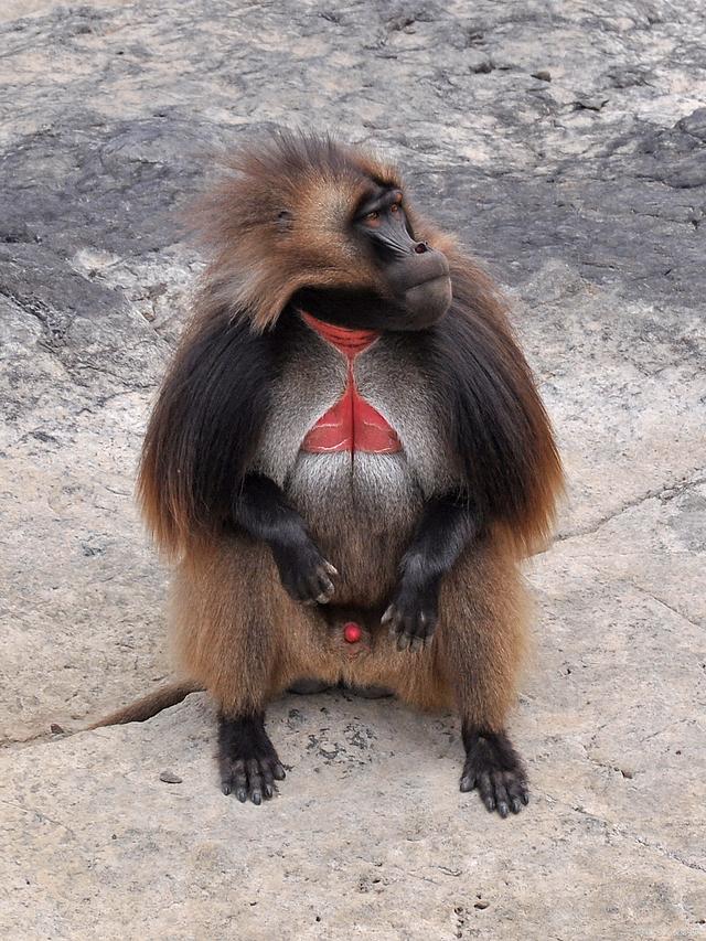 狮尾狒成年雄性体重约20公斤,身体长度达70厘米左右,雌性则略小。他们的身体可以说是很健壮的,胸部肌肉十分发达,手臂和腿部均很强壮有力。 狮尾狒的面部具有黑色皮肤, 这些皮肤上血液流量很大,在情绪波动时会将嘴唇翻起,露出獠牙。身体覆盖着灰色长毛,毛发长度极长,尤其是尾巴的毛发最长可达20厘米左右,呈圆锥状并可拧成结合,看起就像是狮子的尾巴,故得名“狮尾狒”。 狮尾狒主要分布在埃塞俄比亚的高原地带。他们喜欢栖息在较为稠密的森林和草原,也常见于岩石峭壁和山脉中。具有一定的灵活性,可以适应高温的气候及气温的大幅度变化,同时也能耐受干旱和寒冷的环境。他们主要以果实、种子、根茎、草本植物等为食,有时也捕食昆虫、鸟类或小型哺乳动物。