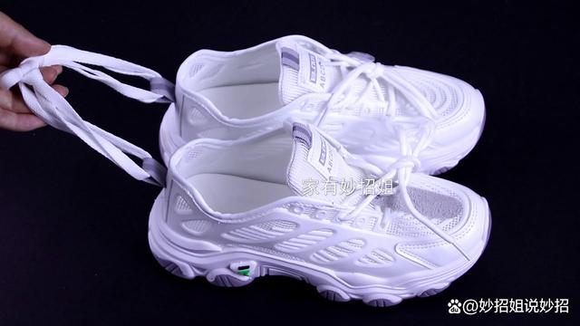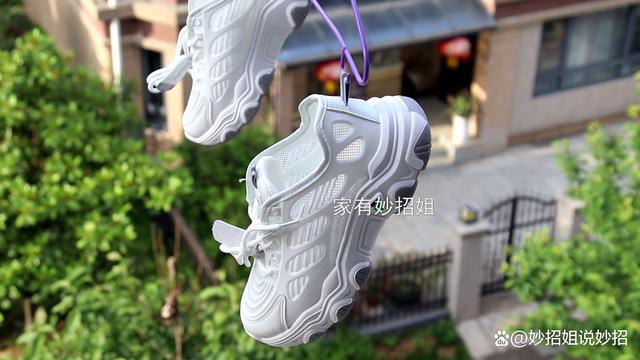 作用二:方便晾晒。 当鞋子穿脏了之后,就需要清洗晾晒了。说起晒鞋子,相信很多朋友就是将鞋子靠在墙边或窗边,甚至就直接放在阳台晾晒。但这样往往晒上大半天,在鞋跟处还会留有一滩水,就算大晴天的情况下,也要晒上3~4天,才能把鞋子完全晒干来。其实晒鞋子,脚后跟的小尾巴也能发挥大作用。只需要将“小尾巴”挂在衣架的挂钩上,这样鞋子就是呈一个直立的状态,我们再拿去晾晒的话,水分就会顺流而下,也就能快速的将鞋子晒干了。