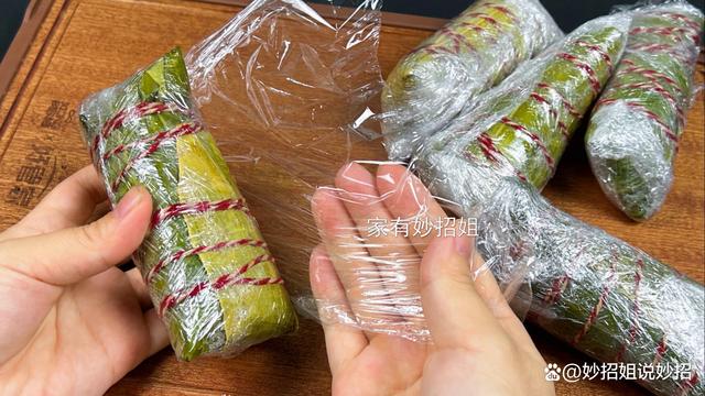 接下来,我们再拿出保鲜膜,用保鲜膜在粽子的表面缠绕几圈,把粽子一个个的都包裹起来。这一步的目的就是可以很好的锁住水分,避免粽子的水分流失,而且保鲜膜还能起到阻隔外界异味和细菌的作用,确保粽子的卫生和纯净。