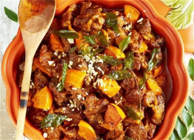 三、南瓜咖喱牛肉 所需材料: 南瓜300克,牛肉500克,红洋葱30克,椰子脆片20克,红咖喱酱100克,咖喱叶2枝,油15毫升,盐5克,热水700毫升(www.wS46.com) 具体做法: 1.切成大块的牛肉和碎红洋葱。 2.在锅中倒入油,加热,加入洋葱碎,炒香。 3.将牛肉块加入锅中,翻炒5~6分钟,直到牛肉边缘泛焦,加入咖喱酱和热水,盖上锅盖小火炖1.5小时。 4.1.5小时后,将南瓜块加入锅中,继续焖煮15~20分钟,加盐调味,出锅后撒上椰子脆片和咖喱叶即可。 四、南瓜鲜贝红枣排骨汤 所需材料: 无核红枣5-6颗,南瓜200克,鲜贝50克,排骨250克,鹌鹑蛋8个,姜片、料酒、盐、鸡精各少许 具体做法: 1.煮熟鹌鹑蛋,剥去壳,将南瓜切成块状,煮熟排骨并去除杂质。 2.在炖锅中放入清水,加入排骨、姜片、料酒,加入南瓜、红枣、无核红枣、莲子。 3.煮沸后,加入鲜贝和鹌鹑蛋,煮开后,加入盐和鸡精,即可享用。 五、南瓜百合粥 所需材料: 南瓜半个(约300克),香米100克,糯米100克,百合、桂圆肉、红枣、莲子各20克,白糖、盐适量 具体做法: 1.浸泡红枣和莲子20分钟,去莲子的心,洗净备用。 2.将去皮的南瓜切成块状,将香米和糯米洗净,将它们加入一锅中,加水烧开。 3.加入南瓜块、红枣、莲子、百合和桂圆肉,文火煮20分钟,搅拌一下。 加入适量的白糖和盐,根据口味调味即可。