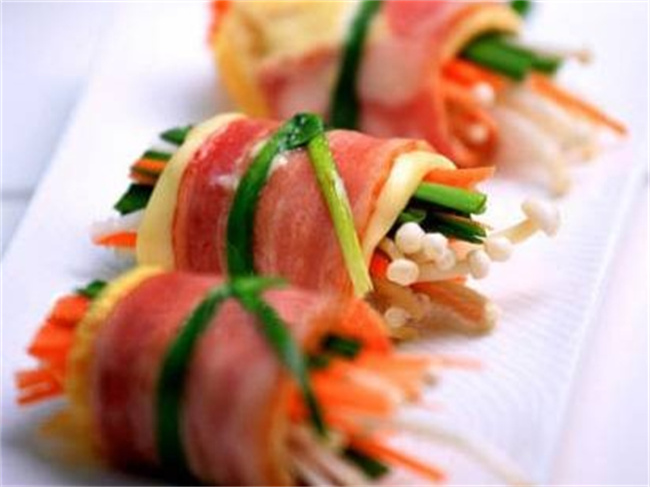 三、胡萝卜金针奶酪卷 材料:胡萝卜、金针菇、韭菜、香葱、鸡蛋、奶酪片、培根 做法: 1. 将胡萝卜切丝,韭菜切段,金针菇切段,鸡蛋撒在锅上制成薄蛋饼。 2. 在蛋饼上铺上奶酪片、培根片、胡萝卜丝、韭菜、金针菇,卷成卷。 3. 使用香葱或者烫过的韭菜将蛋皮卷固定好,放入微波炉中烤2分钟,等奶酪融化后即可取出装盘。 四、干煸杏鲍菇 材料:杏鲍菇300g,芝麻10g,花生10g,姜适量,花椒10g,干辣椒10g,酱油一勺,香油一小勺,盐、松茸调味粉适量 做法: 1. 干炒花生和芝麻,撕成杏鲍菇细丝,切碎干辣椒,切片姜。 2. 热锅凉油,将杏鲍菇煸炒至表面焦黄,备用。 3. 锅中再次加少许油,小火炒香花椒,加入干辣椒和姜,加入炒好的杏鲍菇,翻炒均匀。 4. 调入酱油,加入盐和松茸调味粉,淋上香油。 5. 最后,撒上炒香的芝麻和花生碎,翻炒均匀后出锅。 五、口蘑豆腐汤 材料:豆腐半块,口蘑10个,白菜心一小根,葱一根,小虾米 做法: 1. 准备豆腐、口蘑、白菜心、葱、小虾米。 2. 烧热锅,加少许油,爆炒葱花,加入豆腐、白菜心,倒入汤煮熟。 3. 汤烧开后加入口蘑,煮一会儿后加入盐和少许小虾米,即可上桌。