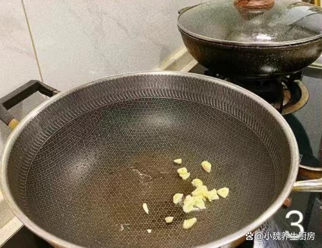 第四步:锅底加上少许猪油,放入大蒜头爆香,还可以加上一些猪油渣,这样吃起来更香,倒入口蘑炒至变软。