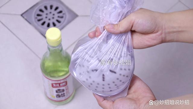 接着,我们准备一个牢固一点的塑料袋,不会漏水的那种。再把拆卸下来的喷头直接放在塑料袋中,手柄朝上。接下来,再往塑料袋中倒入多一些的白醋,尽量将整个喷头都完全浸泡在白醋里。白醋中的醋酸就具有很好的软化作用,我们用它来浸泡,就可以将喷头表面已经内部堆积的水垢都软化。白醋倒好,我们将袋口扎紧,把它悬挂或放在某个地方,就这样让喷头在醋水中浸泡1~2个小时。
