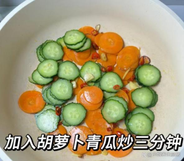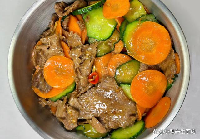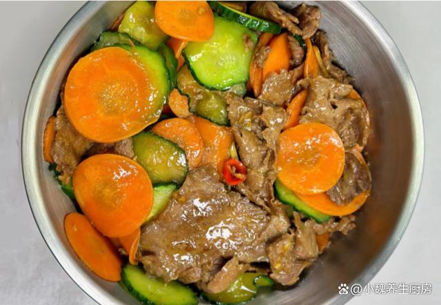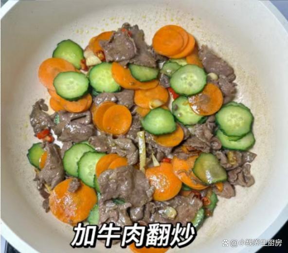 进入10月份的月末,明日是10月23日,又是农历九月初九,是中国民间的传统节日,这个时候已经到了秋季的尾声,气温也渐渐降低,早晚的温差也越来越大,天气变得阴冷潮湿。每年秋冬季节交替的时候,都不知道吃啥菜,许多夏季蔬菜已经下市,餐桌上出现许多蔬菜,比如说萝卜。今天准备用胡萝卜,黄瓜和牛肉制作而成,菜色特别好看,牛肉十分嫩滑细腻,为身体补充许多营养,强健身体,增强抵抗力。许多人没有吃过这道胡萝卜黄瓜炒牛肉片,到底应该如何制作呢?跟着小编看一看此菜的烹饪技巧吧。重阳节将至,有钱没钱,多给家人吃这菜,营养全面,顺利过冬。  【胡萝卜黄瓜炒牛肉片的食谱解析】 食材明细:挑选胡萝卜1-2个(胡萝卜是色泽好看的时令菜,胡萝卜的营养价值特别高,其中胡萝卜素食孩子最需要的物质,能够保护我们的双眼,吃起来也不会长膘),老姜若干片,生抽少许,蚝油一勺,玉米淀粉若干,辅食油少许,若干个大蒜头,黄瓜一根,小米辣几个,清水少许,挑选新鲜牛肉半斤(牛肉要选购新鲜的,牛肉片要腌制和去腥),鸡精和味精少许,生抽和蚝油若干,一丢丢食盐和白糖,其他调味品。 具体制作步骤:步骤1:提前准备好胡萝卜,黄瓜和新鲜牛肉,老姜去皮洗净,切成若干细丝,小米辣去蒂,洗净切成若干小圈,大蒜剥掉蒜衣,切成一些蒜片,备用。步骤2:黄瓜放在容器里,外皮用盐水擦洗,切掉多余的部位,切成厚度相同的片状,胡萝卜也清洗表面的泥土,去皮切成若干薄片,胡萝卜可以用热水焯烫,让胡萝卜口感特别脆口,不会降低其营养价值。 步骤3:牛肉片放在器皿中,加上半勺料酒,加上生抽一勺,加上少许蚝油,裹上一些玉米淀粉,放入一些生姜丝,滴入一些辅食油,用手快速抓拌,让肉片充分腌制入味,口感更佳。 步骤4:锅中预热,加上少许食用油,油温烧热到7成热,滑入腌制入味的牛肉,加上姜蒜爆香,用锅铲快速爆炒,让牛肉炒到变色,将其装盘备用。