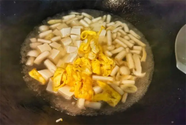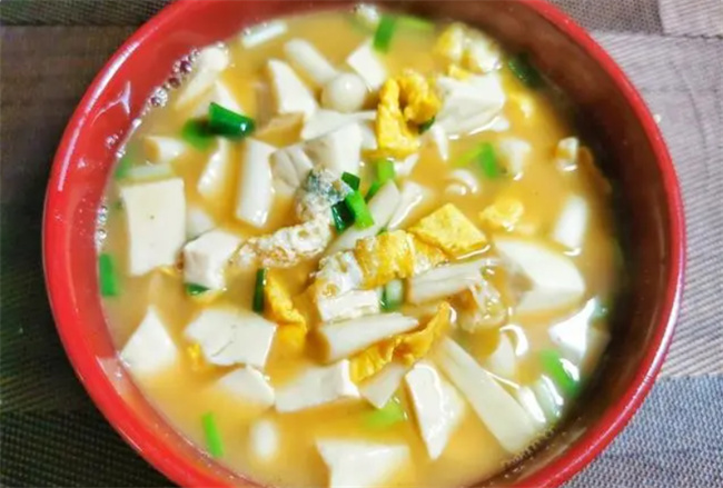 二、做法步骤: 1. 准备食材 选择嫩豆腐,不需要太多,半块足够。记住要选择嫩豆腐,以确保口感更加细腻。将海鲜菇切成段。(www.ws46.Com) 2. 制作鸡蛋皮 首先,打散鸡蛋。在平底锅中倒入少量油,然后将鸡蛋液倒入锅中。摇晃锅,将鸡蛋液煎成薄薄的鸡蛋皮。鸡蛋液凝固后,即可将其卷起,然后出锅备用。 3. 准备鸡蛋皮 将出锅的鸡蛋皮切成条状,当然也可以根据个人口味切成其他形状。 4. 炒制食材 在锅中加热油,将海鲜菇和大蒜一起炒制,直至它们变软。随后,加入适量的开水。 5. 烹制豆腐汤 将切好的嫩豆腐、鸡蛋皮,以及生抽、蚝油、适量的盐加入锅中。用中火烧煮约六分钟,直至豆腐变得嫩滑,而汤汁充满鲜美的味道。在起锅前,可以撒上一些胡椒粉和花椒粉,再撒上新鲜的葱花。不需要额外加入鸡精或味精,以保持食物本身的鲜美味道。 6. 品味鲜美 出锅后,这碗豆腐汤将呈现出引人食欲的色泽。豆腐鲜嫩,汤汁浓郁,赶紧品味这道美味吧!