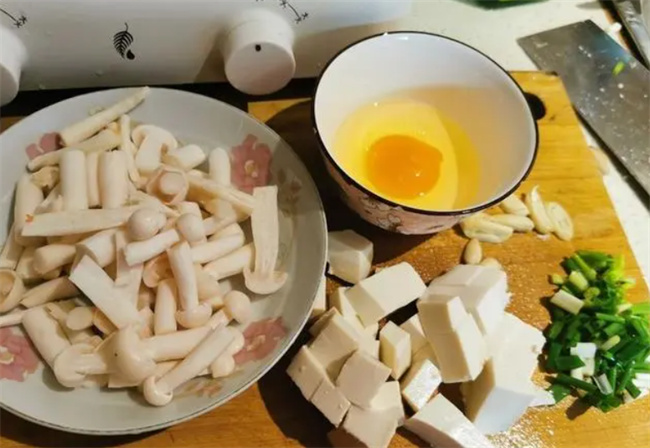 一、食材准备: 嫩豆腐 鸡蛋 鲜菇 蚝油 生抽 蒜 葱花