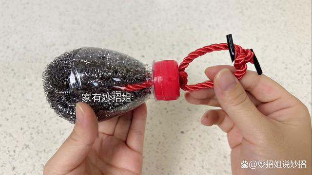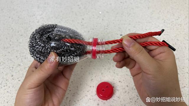 绳子穿好后,我们将瓶盖拧回瓶口处,然后再将绳子拉紧。这样钢丝球就牢牢地卡在了塑料瓶中。最后,把绳子再瓶口处打个结固定,使钢丝球不会轻易掉落。然后在绳子的末端也打个结,这样一个刷锅神器就制作好了。