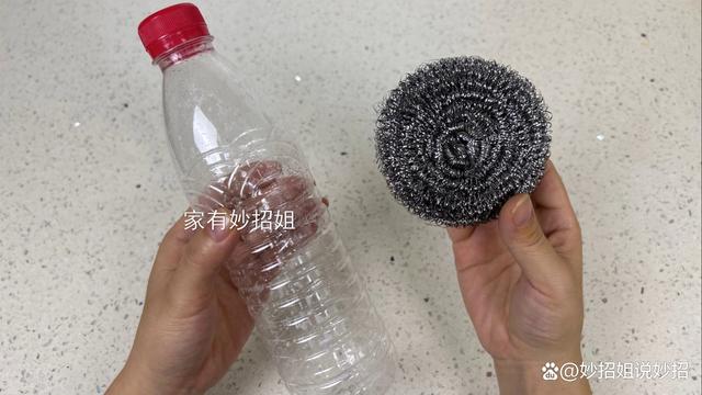 接下来,再准备一根牢固点的绳子和钢丝球。钢丝球就是我们刷锅洗碗时经常会使用到的工具了,它表面非常的粗糙,对于一些顽固污渍,利用钢丝球就能轻松刷洗干净。但钢丝球的结构特殊,使用过后就会有一些残留隐藏在里面,导致每次使用的时候,都会粘的满手油腻。其实,我们只需要先将绳子穿过钢丝球的中间,要是家里的钢丝球比较小的话,也可以用上两个。然后再把绳子的两端从瓶口穿过,接着再分别从瓶盖上的两个孔洞中穿出。(www.ws46.cOm)