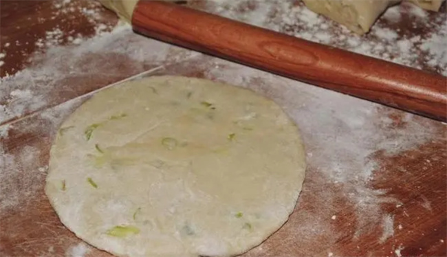 二、制作葱花饼的步骤: 1.准备面团 将普通面粉放入一个和面盆中。缓慢地将开水倒入面粉中,一边倒水一边搅拌,直至没有明显的干粉颗粒。请注意,水的倒入速度不宜过快,以免面糊太稀。用筷子搅拌至面团初步形成,用手将面团揉搓,直至变得光滑。在案板上撒些干粉,将面团取出并放在案板上备用。 2.擀面皮摘自: www.ws46.com 用擀面杖将面团擀成薄而均匀的椭圆形面皮。使用硅胶刷在面皮上均匀刷上一层食用油。 3.准备葱油 将准备好的小葱切成葱末,放在一个小碗中,加入适量盐。用热油轻轻泼在葱末上,这有助于融化盐,还能激发葱的香气。将搅拌均匀的葱油涂抹在面皮上。 4.卷制面团 将涂抹了葱油的面皮从一个方向开始卷起,直至形成一个面团卷。 5.修整面团 将卷好的面团两端往后收拢,以确保紧密封口。 6.切剂子 将修整好的面团卷切成大小均等的剂子。 7.擀制饼皮 将每个剂子拿在手中稍微压扁,再将两端往回收拢。将横切面朝上,继续擀制成大约1厘米左右厚的面饼。 8.煎制葱花饼 在平底锅中加入少量食用油,待油七八分热时,将面饼放入平底锅中。在锅中煎制,翻面,约煎制两到三分钟,直至两面都变得金黄。 9.享用美味 撒上一些葱花,一盘外酥里软的葱花饼就制作完成了,是不是超级简单?