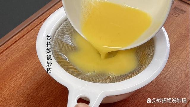 第三步:将鸡蛋和水搅拌好后,我们还需要用筛网把鸡蛋液给它过滤一下。在鸡蛋液中都会有少许的白筋和气泡。经过过滤,去除了白筋和气泡,就能确保鸡蛋羹的口感更加细腻,而且也能避免蒸制后鸡蛋羹表面出现不平整的现象。