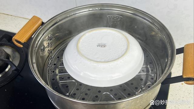 第四步:现在我们就可以将鸡蛋羹放入锅中去蒸制了。先把蒸锅中的水烧开,然后再将鸡蛋液放在蒸屉上,接着在上面倒扣一个盘子,或者覆盖一层保鲜膜。这一步的目的,就是可以防止在蒸制的过程中,水蒸汽滴落在蛋液上,导致蛋液表面坑坑洼洼的,一点都不平滑。如果覆盖的是保鲜膜的话,要记得在保鲜膜上用牙签扎一些小孔洞,以便蒸汽溢出。