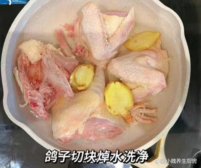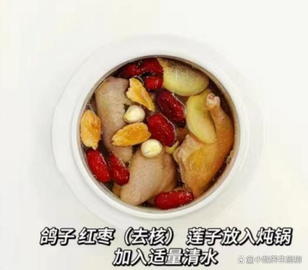 3:将鸽子提前宰杀好,去掉多余的部位,绒毛要处理干净,避免鸽子汤非常腥,鸽子肉剁成小块,用流水冲洗干净,备用。 4:红枣去核洗干净,枸杞子要冲洗掉表面的灰尘,锅中放入鸽子肉,加上适量冷水,放入姜片,加上适量黄酒,把鸽子肉焯水处理,去掉里面的腥味。 5:提前准备好电饭煲,放入一些鸽子肉,红枣,莲子,陈皮等等,盖上锅盖煲2个小时,中途可以舀掉一层浮沫。 6:最后放入一些山药块,继续炖煮一会儿,丢入一些枸杞子,加上一丢丢食盐,调入半勺白胡椒粉,焖煮一小会儿,关火盛出,这款山药莲子炖鸽子汤就烹饪完成了。 山药莲子炖鸽子汤是一道深受中老年人喜爱的营养汤品主要选用新鲜山药、莲子,鸽子和红枣炖煮而成,汤汁鲜美不油腻,山药非常软绵,莲子非常清甜,鸽子肉质鲜嫩,具有补虚益气,养心安神,缓解体虚体弱的情况,身体更健康。 小伙伴们,你们是否喝过这款山药莲子炖鸽子汤呢?(文中配图都出自网络)