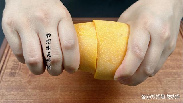 2. 刀切法 切好后,我们用手分别抓住芒果的两端,然后反方向地转动,再往外一拉。