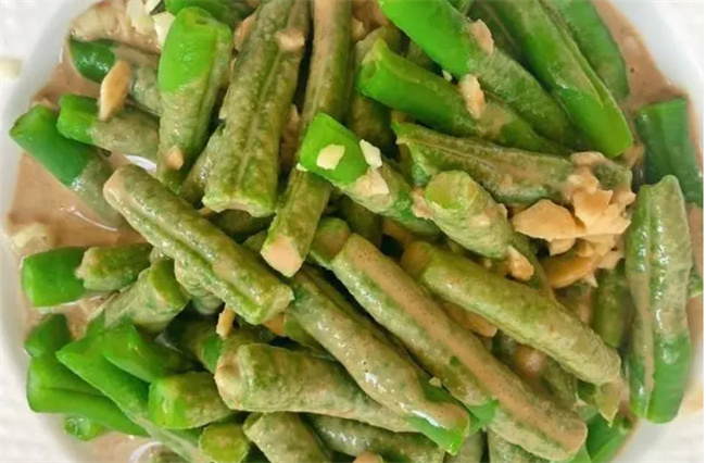 制作步骤: 一、准备豆角 将豆角洗净并沥干水分,然后用手掰成小段,准备好以备使用。 二、焯水处理 1. 将一锅水烧开,加入一勺盐和几滴植物油。 2. 将豆角放入开水中焯水,用中小火焯煮大约五分钟。这个步骤的目的是让豆角焯熟,但不要过分软化。同时,加入盐和油能够保持豆角的颜色鲜绿。 三、冷水冲洗 将焯好的豆角捞出,立刻放入凉水中,多次冲洗,以保持豆角的脆爽口感和鲜绿颜色。然后将豆角沥干水分,并摆放在盘中,撒上蒜末。 四、制作麻酱汁 1. 取一小碗,将三到四勺麻酱放入碗中。 2. 加入半茶勺糖、一勺生抽、一勺米醋以及适量的盐。 3. 倒入小半碗凉白开水,搅拌均匀,直至麻酱和其他调味料充分混合。 五、淋麻酱汁 将调好的麻酱汁均匀地淋在摆放好的豆角上。麻酱汁的丰富香味与翠绿的豆角相得益彰,使这道菜既脆爽,又充满香气。