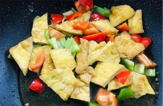 二、制作步骤: 1.准备食材 将油豆腐泡干切成小块。 2.切配蔬菜 将青辣椒和红椒切成小块,葱切成段,大蒜切成片。 3.炒香大蒜和葱 在炒锅中,加热适量的食用油,加入大蒜和葱段,翻炒至散发出香味。 4.炒制油豆腐 将切好的油豆腐块加入锅中,略微翻炒。 5.加入调味料 加入料酒、盐、白糖、生抽、耗油和少量胡椒粉,继续翻炒。 6.焖烧菜肴 将清水加入炒锅中,再加入青辣椒和红椒片,搅拌均匀后盖上锅盖焖烧。 7.加入味精和湿淀粉 当汁液变浓稠时,加入味精,稍微勾芡。出锅装盘,准备享受这道色香味俱全的焖烧油豆腐。