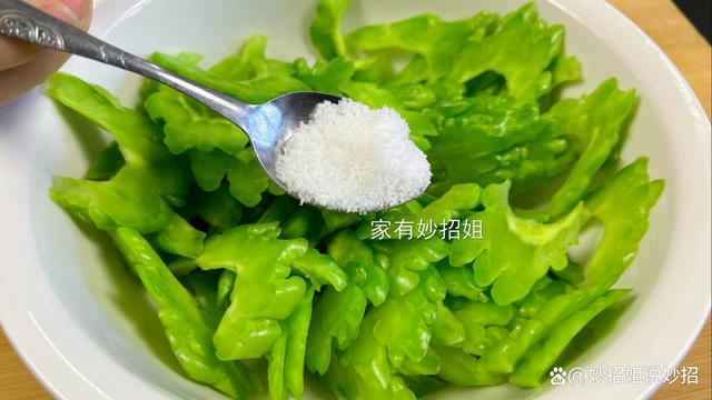 接下来,我们再将切好的苦瓜都放在一个大碗中,然后再往碗里倒入一勺食盐,用筷子搅拌搅拌,使每片苦瓜都沾到食盐。搅拌好,把苦瓜放一边,就这样腌制上十分钟左右,让食盐杀出苦瓜中的水分。