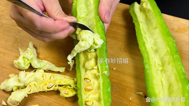把苦瓜清洗干净后,我们将它放在案板上,然后把苦瓜的头尾分别切掉一点不要。切好,再从苦瓜中间切一刀,把苦瓜一分两半。 我们都知道,在苦瓜的中间是有瓜瓤以及瓜籽的,虽然它们也可以食用,但味道很苦,而且也会影响口感,就需要将它们给去除了。为了将瓜瓤和瓜籽更好去除,我们可以拿个不锈钢的勺子,用勺子刮一刮。由于不锈钢勺子的边缘薄,而且还坚硬,很轻松的就能将瓜瓤瓜籽都刮干净了。