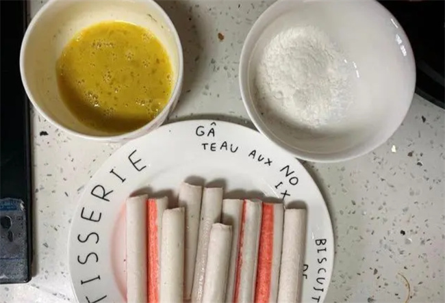 一、制作鸡蛋蟹棒的食材: 1.适量的蟹棒 2.1个鸡蛋 3.1大勺淀粉 4.适量的黑胡椒粉
