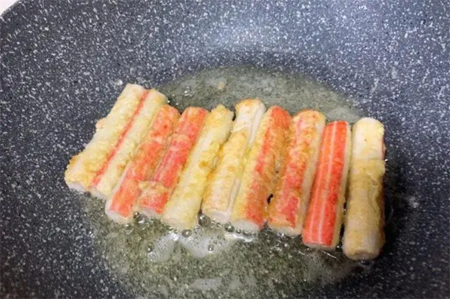 二、制作步骤: 1.准备食材 将蟹棒解冻。打散一个鸡蛋,加入一些黑胡椒粉,备用。此外,准备一大勺淀粉。 2.裹上淀粉 将蟹棒逐一在淀粉中滚一圈,确保它们均匀地裹上一层薄薄的淀粉。这将有助于蛋液附着在蟹棒表面,使其更加美味。 3.涂抹蛋液 接将裹有淀粉的蟹棒逐一涂抹鸡蛋液。确保每根蟹棒都被均匀地覆盖。 4.煎制蟹棒 在平底锅中加入适量的食用油,放入蟹棒。用小火慢慢煎炸,翻转,直到两面变得金黄脆脆的。 5.享受美味 将煎制好的蟹棒取出,装盘。这款鸡蛋蟹棒非常美味,尤其当你撕开蟹棒时,外酥里嫩,鲜味十足。你一定会爱不释手,忍不住多吃几根。如果还没有尝试过这个美味的组合,不妨赶紧试试吧。