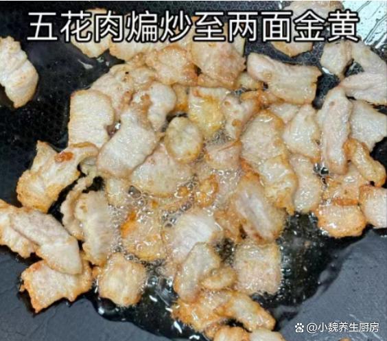 第四步:锅底烧至温热,锅底调入适量食用油,倒入五花肉快速爆炒,让油脂都炒出来,两面微微金黄,多余的油脂要盛出来,不然菜肴吃起来太油腻。