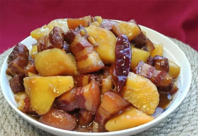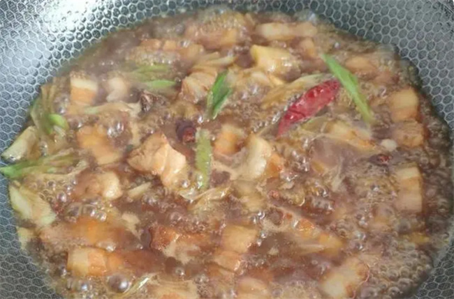 二、制作步骤: 1. 将五花肉去除残余毛根,洗净后切成约2厘米见方的小块,备用。 2. 将大蒜切成大粒,姜拍散,大葱切成大片,准备好花椒、八角、桂皮和干辣椒。 3. 土豆去皮洗净,切成滚刀块,备用。 4. 将五花肉放入冷水中,加入10克料酒,煮沸后撇去浮沫,煮3分钟,捞出并冲洗,去除残渣并控净水分。 5. 锅中加入适量的油,加入白糖,小火炒至糖色变化,加入五花肉,翻炒至上色,随后加入蒜、姜炒香。 6. 倒入料酒,加入开水,调入适量的老抽调色,大火煮开后转中小火,炖煮60分钟。 7. 在炖煮45分钟后,加入土豆块,适量的盐调味。等土豆熟透后,大火将汤汁收浓,加入少许鸡粉调味即可。