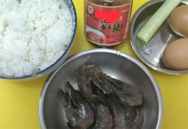 一、所需食材: 1.凉大米饭 1碗 2.鸡蛋 2个 3.油泼辣子 1勺 4.葱 1小段 5. 鲜虾 8个 6.黄酒 1勺 7.盐 适量