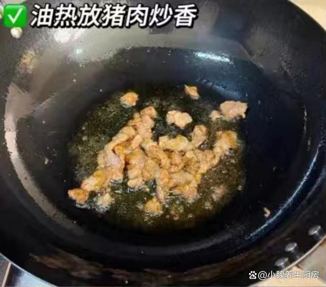 第五步:冷锅烧热油,等待油温快速烧热,倒入腌制好的猪肉末,快速煸炒几下,将猪肉炒至变色。