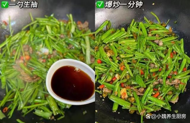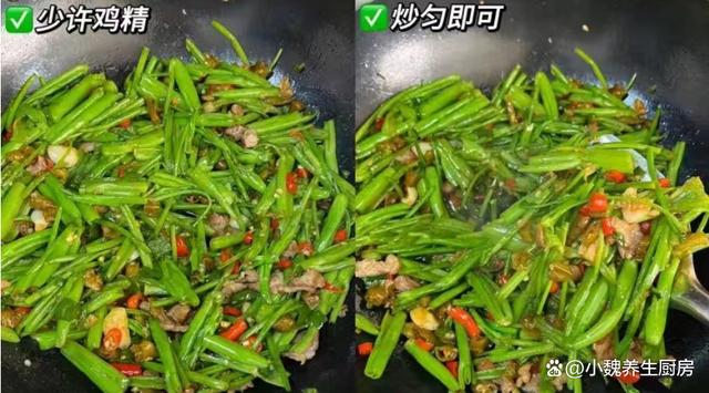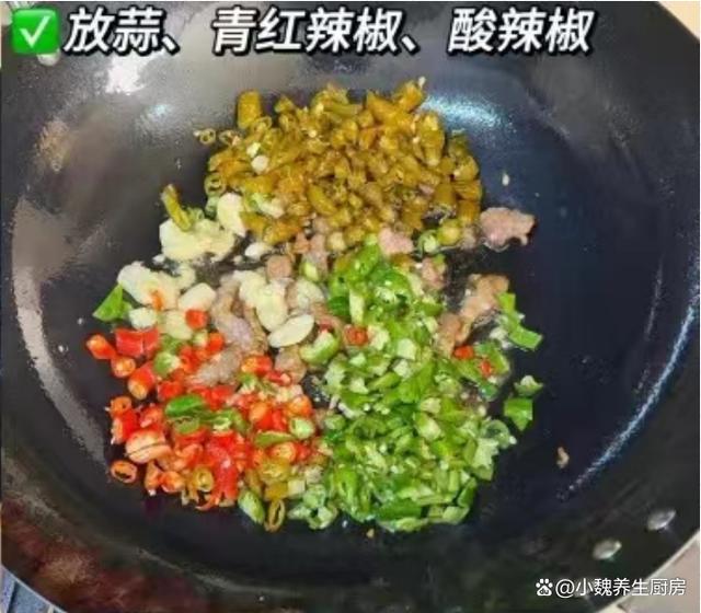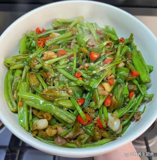 转眼就到了十月中旬,前段时间还在过节,时间过得飞快,还过几个月就要过年了,秋季也要接近尾声,马上要迎来冬天,感觉最近很劳累,身体总是有气无力,老公和孩子都说没有胃口。作为家庭的掌厨人,每天要安排一日三餐,每一餐要讲究营养搭配,还有考虑菜肴的成本,我们家一般为三餐一汤,今天分享其中一道非常开胃的家常菜——酸辣空心菜梗炒肉末,几分钟就搞定,鲜嫩美味,总吃不腻。秋天,有钱没钱,多给家人吃“这菜”,荤素搭配,营养易消化!  【酸辣空心菜梗炒肉末的正确做法】 食材清单:选购新鲜空心菜梗250克左右(空心菜是一种时令的蔬菜,叶子和根茎都能够食用,叶子可以用来素炒,根茎吃起来非常脆甜可口,可以搭配各种肉类炒着吃,吃起来特别下饭),泡椒若干个,小米辣和线椒少许,若干瓣大蒜头,冷水少许,生抽和蚝油少许,一小勺鸡精,食盐若干,适量食用油,新鲜前腿肉150克(一定要选择新鲜红润的猪肉,也可以用牛肉里脊替代,猪肉一定需要提前腌制调味,还要掌握烹饪的火候),其他。 正确制作顺序: