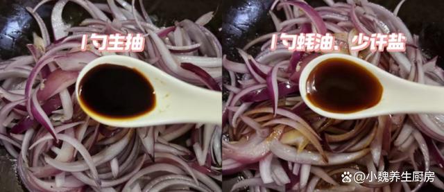 第五步:锅中继续加上油,放入一些洋葱丝炒至断生,加上一勺生抽和一勺蚝油,加上半勺食盐和一勺食盐,迅速翻炒均匀。