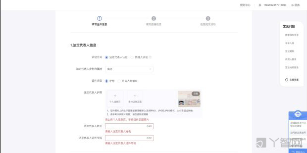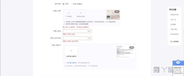 · 代理人入驻需提供信息 o 选择代理人的归属地 o 法定代表人身份证照片 o 法定代表人姓名:与营业执照法定代表人姓名一致 o 法定代表人身份证号:与法定代表人身份证证件号码一致 o 代理人身份证照片:需要提供代理人证件人像面和背面照片和代理人手持代理人证件人像面照片 o 代理人姓名:与代理人身份证姓名一致; o 代理人身份证号:与代理人身份证上所示证件号一致; o 代理人授权书:下载授权书模板,按照要求填写后,上传。 3)营业证件信息 # · 营业执照图片 o 营业执照图片需清晰完整有背景。 · 营业执照类型 新版营业执照(三证合一)