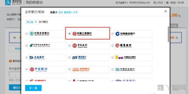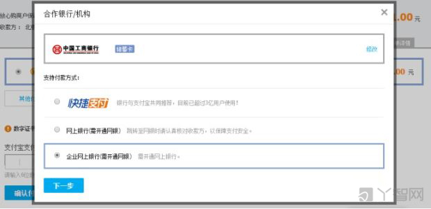 在支付付款方式中选择[企业网上银行(需开通网银)],点击下一步 点击[登录到网上银行付款]