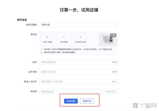 提示 1)您注册成功后,登陆方式无法自助修改,请选择最稳妥保管登陆账号; 2)渠道App上的账号仅用于注册和登录陆使用,小店店铺与渠道号的关联,需要小店店铺营业后到店铺的渠道绑定中进行绑定; 3)请勿随意注销渠道App上的账号,注销后,您将无法登陆小店。 1)商家可以填写任意身份证件的基本信息,开始试用店铺。以试用身份,查看店铺功能。或者不提交试用信息直接选择开店