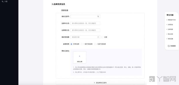 选择特殊主营类目,必需要在其他信息里提交相关资质,在此处上的资质主体需要与入驻时保持一致,且经营范围包含所选的主营类目。具体规则请阅读:招商入驻标准及资质要求 4) 品牌资质
