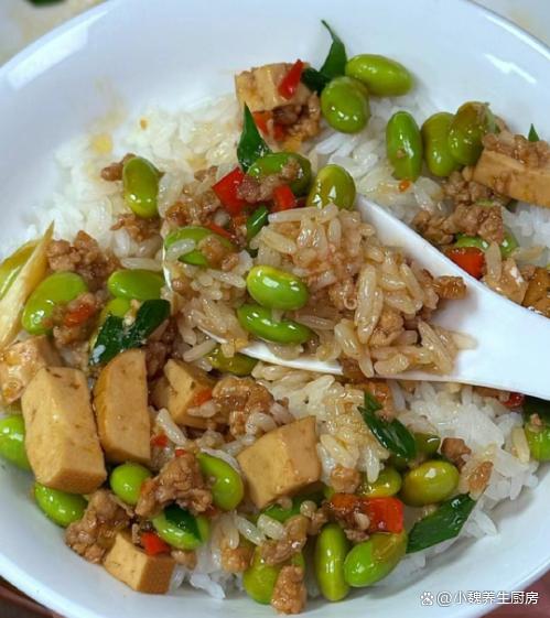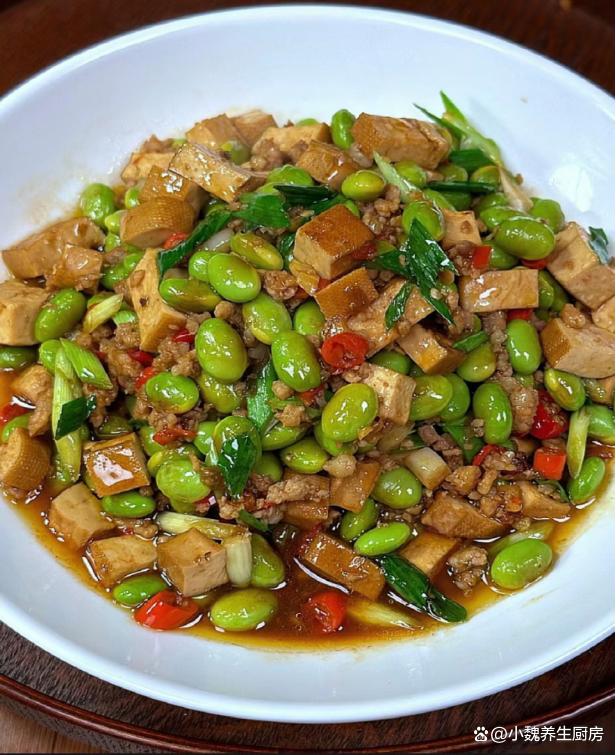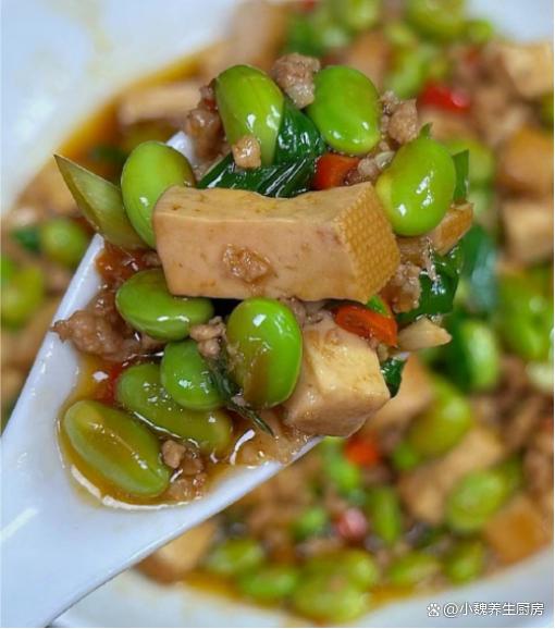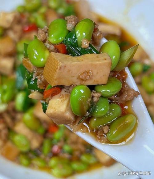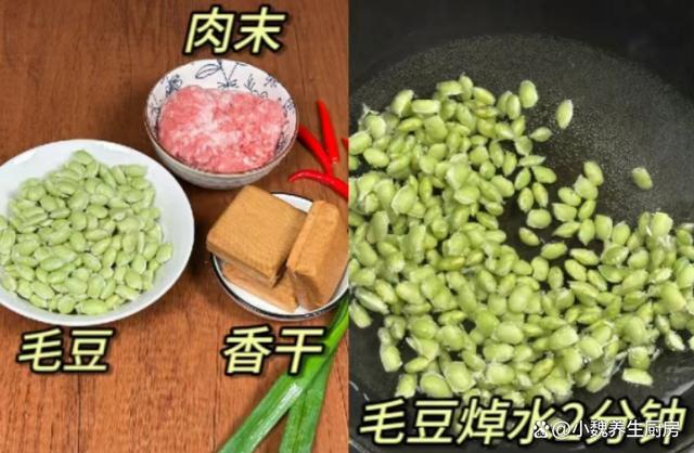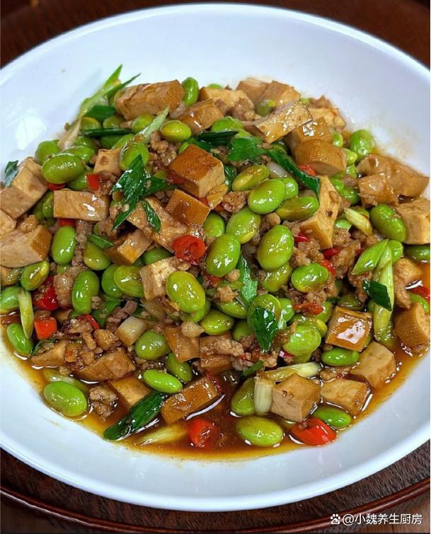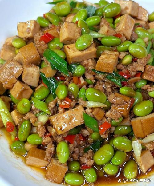 进入凉爽的秋天,十月份后要迎来降温,温度持续走低,感觉最近很迎来,早晚温差特别大,我们总是感觉白天困倦,吃啥都没有胃口。对于许多上班族而言,每天都忙碌着工作,午餐在公司吃外卖,晚上一家人都在家,孩子不喜欢吃外卖,只能每天给孩子换着花样做各种美味的菜肴。每天做饭,不仅仅要考虑营养搭配,要讲究荤素搭配,每餐都不会重样,才能让家里人胃口越来越好。今天分享一款超级下饭菜——毛豆香干丁炒肉末,色泽诱人,解馋开胃,总吃不腻。秋季,多给家人吃这菜,荤素搭配,营养全面,全家都赞不绝口。  【毛豆香干丁炒肉末的正确做法】 准备一些食材:选购新鲜毛豆250克(毛豆是一种很常见的豆类蔬菜,价格不贵,可以搭配很多食材炒着吃,清爽解腻,好吃又下饭),选购120克优质香干(香干又叫豆干,是一种口感鲜嫩的豆制品,但是需要提前炒熟处理,平常可以多给孩子吃),选购半斤新鲜猪肉或牛肉(一定要选择肥瘦相间,肉质非常新鲜的,是做成肉末的首选),少许生抽和蚝油,冷水少许,小米辣若干个,大蒜头几瓣,一勺米酒,少许食盐和白糖,半勺鸡精和胡椒粉,大蒜叶一根,其他调味品。