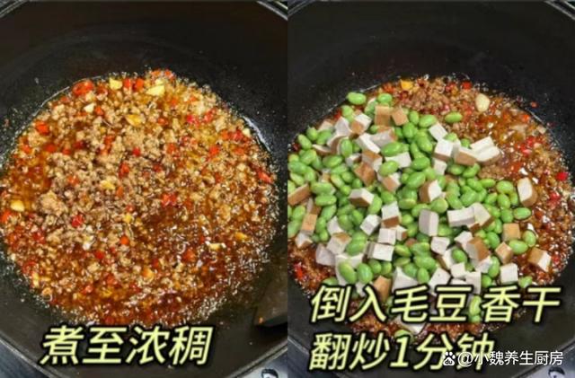 第五步:锅底提前烧热,加上一些食用油,倒入腌制好的猪肉末,调到大火快速爆炒至变色,加上一勺米酒增香。 第六步:放入一些大蒜头,姜末和小米辣,调入少许调味汁(生抽一勺,蚝油半勺,淀粉半勺,食盐和白糖少许,搅拌均匀),将其煮至浓稠。第七步:放入一些毛豆和香干丁,大火快速翻炒一会儿,最后放入一些大蒜叶,加上鸡精和胡椒粉少许,翻炒均匀,收汁出锅,这道毛豆香干丁炒肉末就烹饪完成了。 毛豆香干丁炒肉末这是一道非常下饭的家常菜,而且做法简单,非常适合忙碌的现代人,主要选用毛豆、香干、肉末等食材制作而成,闻起来非常香,解馋开胃,吃起来很下饭。 小伙伴们,你们是否吃过这道毛豆香干丁炒肉末吗?(文中配图都来自网络)