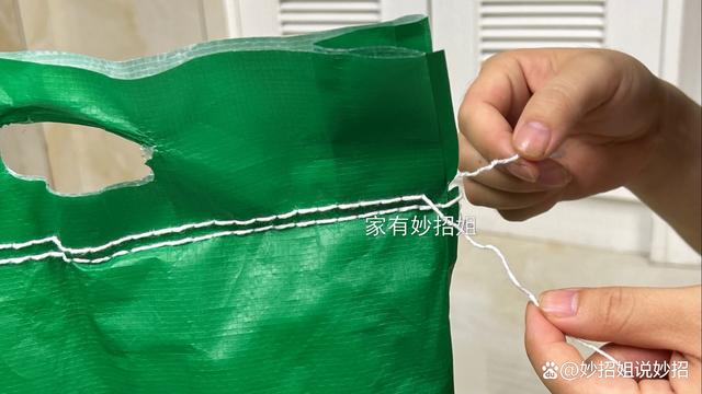 然后再分别抓住两根线,并向两边拉扯,这样封口线又再次的一拉到底,快速的解开了。这样我们的米袋也就被拆开了,而且拆下来的封口线都是完好的。这个封口线是棉线,我们也可以将它收集起来,端午包粽子或者平时需要捆扎袋口以及其他物品的时候,就可以用上这个棉线。