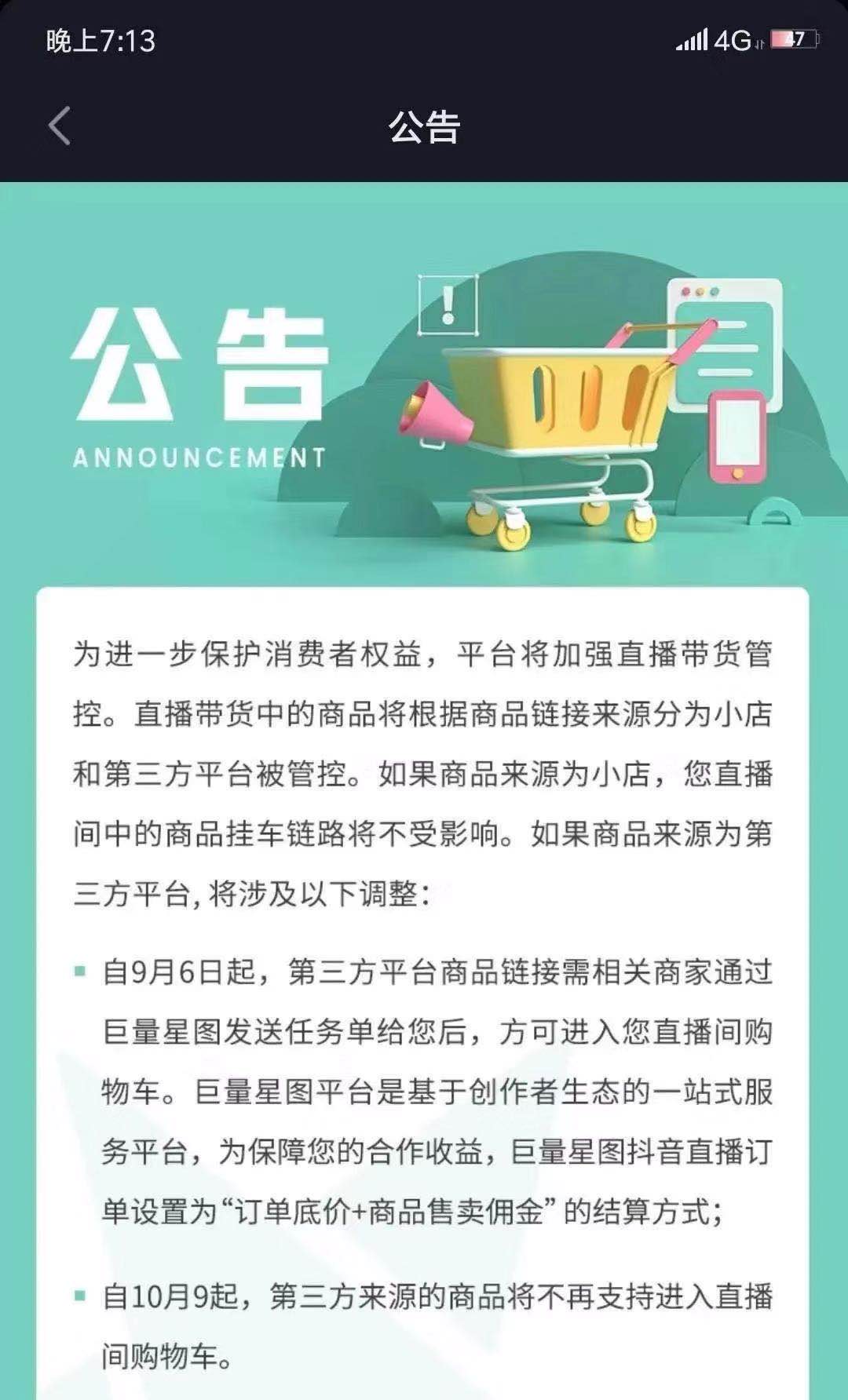 自9月6号起,第三方平台链接需相关商家通过巨量星图发送任务单给你后,才能进入直播间购物车。