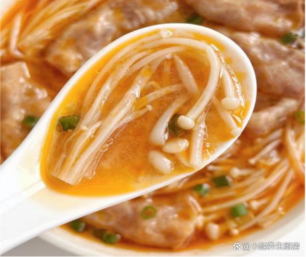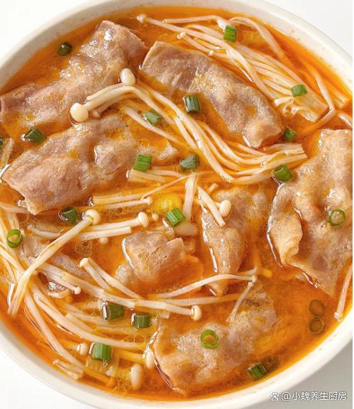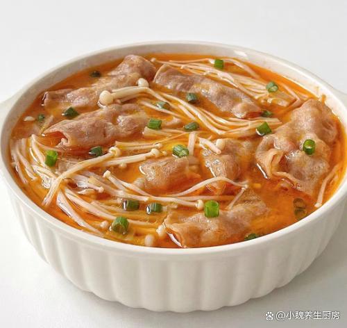 到了十月份之后,迎来金秋时节,桂花飘香,万物出现更替,绿色的叶子变成红色,感觉秋天也非常漂亮,而且天气也非常凉爽,南方人再也不用吹空调了。现在处于秋季的中期,马上就要入冬了,这个时候的气温越来越低,身体会不舒服,胃口会越来越差。自从天冷之后,每天都为了吃啥而操心,吃大鱼大肉,不如给家里人试试这款家常汤品——番茄金针菇肥牛汤,这汤选用肥牛卷,番茄和金针菇制作而成,老少皆宜,解馋又下饭,不懂吃怪可惜。天冷后,建议要多喝“这汤”,简单省事,酸甜可口,增强免疫力。  【番茄金针菇肥牛汤的正确做法】 食材明细:选购新鲜金针菇200克(金针菇是日常生活常见的菌菇,又叫“益智菇”,价格很便宜,口感非常鲜嫩美味,食用方法非常多,比如凉拌,刷火锅和煮汤,荤素都能够搭配,秋季用来煮汤很不错),新鲜番茄120克(番茄属于酸甜多汁的果蔬,番茄用来煮汤很不错),肥牛卷300克左右,香葱若干根,几片生姜,半勺番茄酱,冷水和开水少许,少许食用油,味极鲜半勺,料酒少许,食盐和胡椒粉少许,其他。