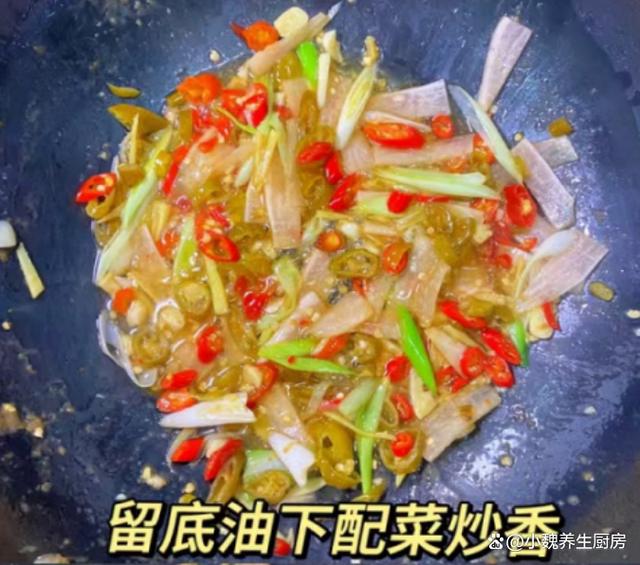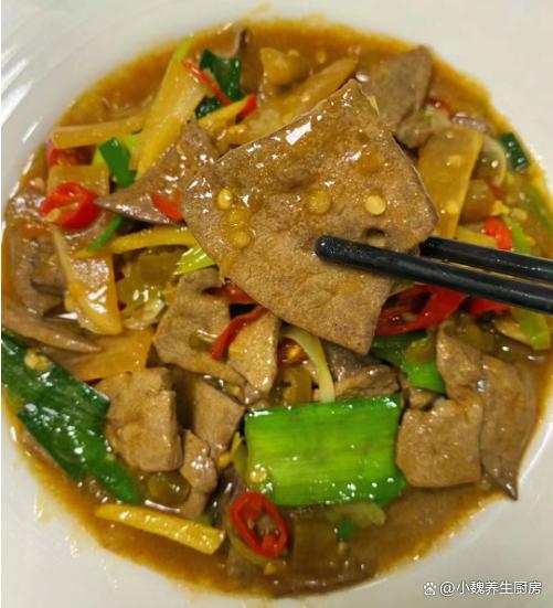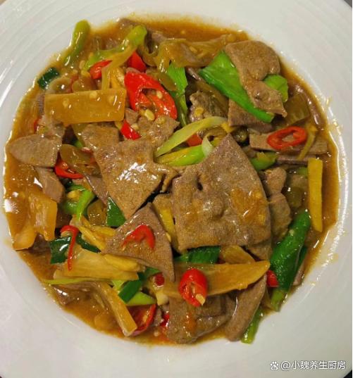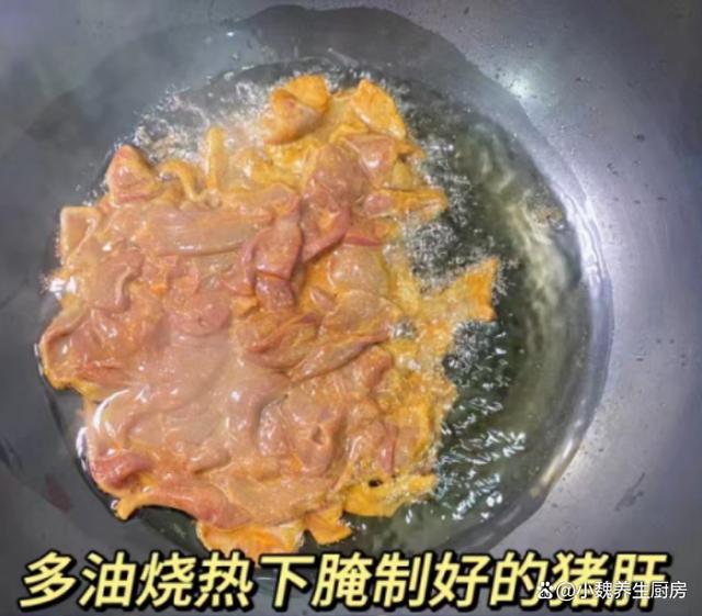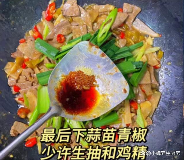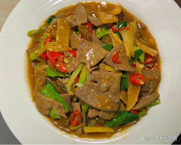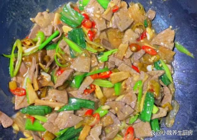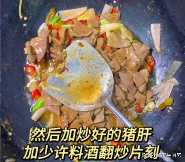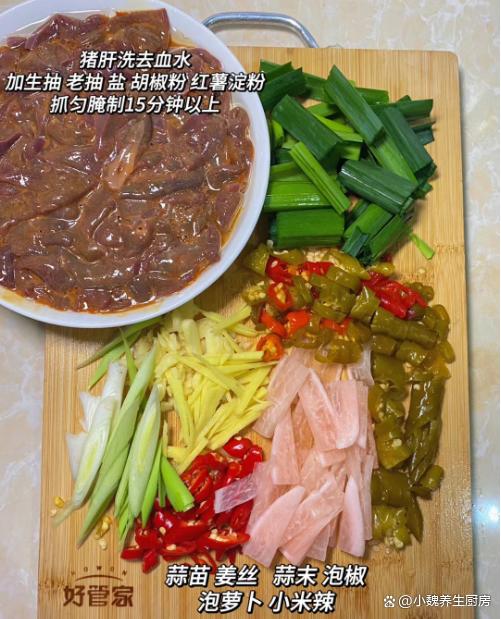 进入十月,我们盼来凉爽的秋天,寒风瑟瑟,秋高气爽,感觉天气越来越冷了,最近天气非常怪异,整天都软弱无力,胃口也超级差。现在人们的生活水平越来越高,但是越来越懒惰,天天只知道外卖,听说很多外卖都是预制菜,吃多了对身体健康不利。今天分享一道我们全家人都爱吃的菜肴——泡椒蒜苗炒猪肝,几分钟就搞定了,口感独特,能够帮助改善食欲,吃起来很香很下饭。十月,吃大鱼大肉,不如吃它,解馋开胃,营养极高,别不懂吃!  【泡椒蒜苗炒猪肝的正确做法】 食材清单:选购新鲜猪肝350克(猪肝是动物内脏,是高营养的食材,铁元素比肉类更高,但是由于胆固醇含量较高,我们一定要适量吃,平常可以给家人吃,保肝护肝,补铁补血,保护我们的双眼,一般用来炒食或煮汤),小米辣若干个,泡椒20克左右,老姜一大块,少许清水,适量生抽和老抽,食盐和胡椒粉少许,红薯淀粉少许,色拉油少许,若干根青蒜苗,泡萝卜40克,料酒少许,鸡精半勺,其他调味品。