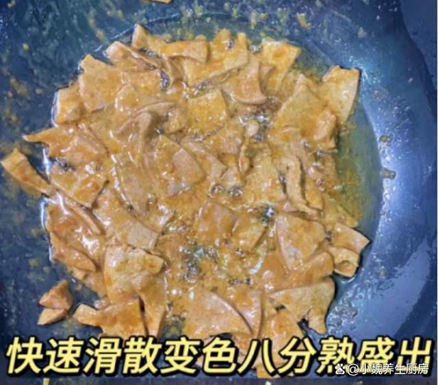 第五步:冷锅热油烧热,倒入腌制好的猪肝片,调到大火快速爆炒,将猪肝炒到8分熟,用锅铲翻炒均匀,盛出备用。