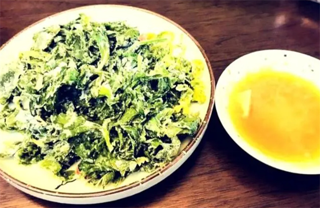 二、制作步骤: 1:准备芹菜叶 将芹菜叶摘下并彻底洗净,稍微沥干水分。 2:涂抹面粉 将适量的面粉均匀涂抹在芹菜叶上,确保每片叶子都均匀裹上面粉而不粘连。 3:蒸煮 将处理好的芹菜叶放入蒸锅中,用大火蒸煮约6分钟,直至芹菜叶变软烂。关闭火源,将其取出。 4:准备调味汁 擦碎一些大蒜,将醋倒入碗中,加入蒜蓉,适量的盐和鸡精,加入一勺香油,搅拌均匀,制成蒜蓉调味汁。 5:享用美味 蒸好的芹菜叶依然保持着脆嫩的口感。可以将芹菜叶蘸入蒜蓉调味汁中食用,也可以将调味汁均匀地浇在芹菜叶上,搅拌均匀后享用。