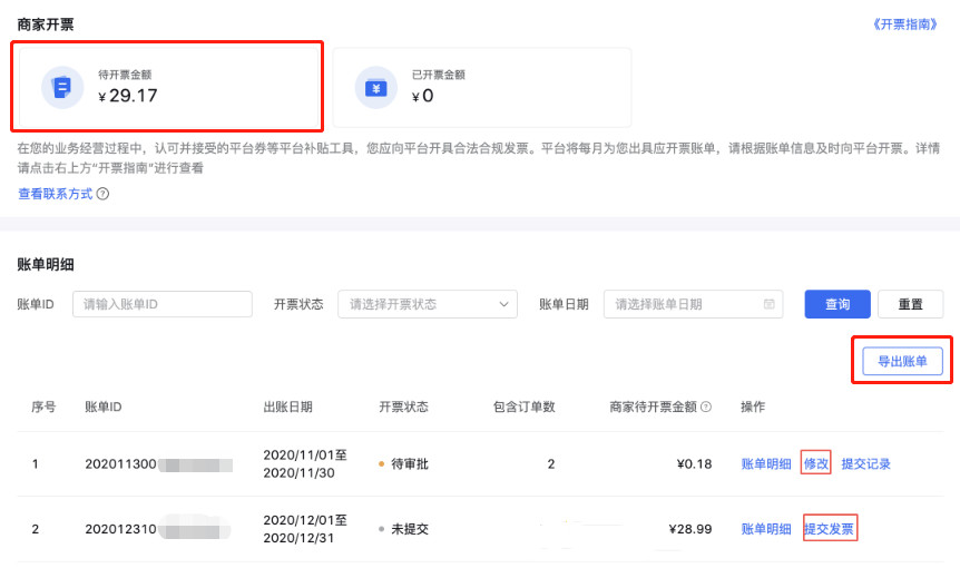 支持以账单ID、开票状态和账单日期为维度,搜索商家的发票进展;可通过选择账单后,导出所需账单明细。