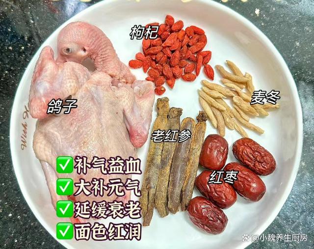 贫血最怕喝“这汤”,平常要多喝它,补血养气,秋冬少生病!现在进入秋季的中后期,马上要迎来寒露节气,我们将要迎来秋季转凉的日子,天气阴冷潮湿,早晚温差越来越大,口干舌燥,身体非常不舒服,女性的气色很差,抵抗力很差,容易引发很多疾病。  俗话说“食补不如药补”,不仅仅春季要养生,秋季也要注意养生,记得多喝暖和和的鲜汤,帮助营养的消化,对肠胃也很有益处。今天推荐一款老少皆宜的补血汤——红参麦冬红枣鸽子汤,主要选择新鲜鸽子,红参,红枣,麦冬和枸杞子制作而成,简单炖一锅,发挥食材的最大营养价值,不懂吃可惜了。贫血最怕喝“这汤”,平常要多喝它,补血养气,增强抵抗力。 【红参麦冬红枣鸽子汤的正确做法】食材明细:选购两只鸽子(鸽子是许多南方人用来炖汤的首选,鸽子汤是一款秋季进补的滋补汤品,比鸡汤更温补,肉质软烂,汤汁浓郁,经常贫血的小伙伴们,一定要多喝鸽子汤,补血养颜,提升免疫力),老红参60克左右,50克枸杞子(枸杞子是养肝明目的中药材,既可以用来泡水,煲汤也可以加一些,发挥其最大的食用价值),麦冬35克,纯净水和冷水若干,少许食盐,白胡椒粉少许,料酒几勺,其他佐料。 (www.Ws46.com) 正确制作顺序: 第一:提前准备好新鲜鸽子,红枣和其他食材,先把一些红枣去掉核,洗净备用,将红参洗净,麦冬用清水洗干净。第二:将生姜切成一些薄片,提前把鸽子处理干净,去掉表面的绒毛,切掉多余的位置,将肚子的内脏取出来,反复将其洗干净,新鲜的鸽子不需要焯水。 第三:准备好一个砂锅,锅一定要大一些,锅中放入鸽子肉,加上两勺料酒,放入红枣,党参,麦冬,姜片和葱结,加上足量的纯净水,开大火炖煮50分钟,中途要舀掉一层浮沫。