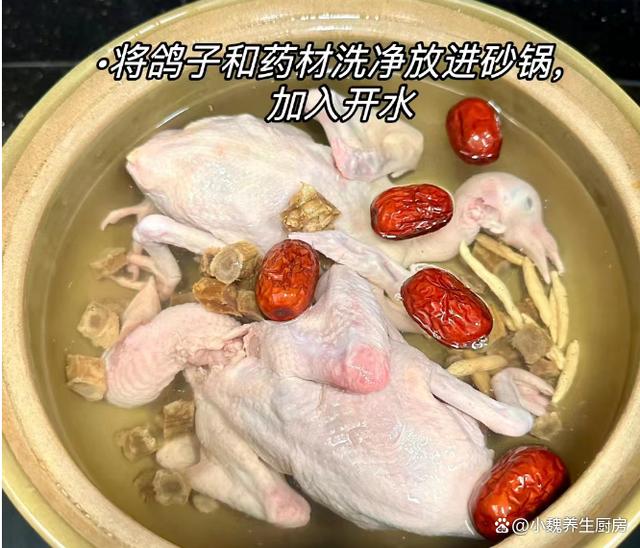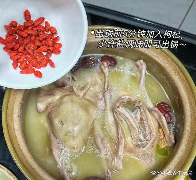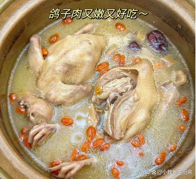 第四:转小火继续焖煮,让汤汁慢慢煮至淡黄色,鸽子肉煮至软烂,最后放入一些枸杞子,小火焖煮一会儿。 第五:放入少许食盐调味,加上白胡椒粉少许,用勺子快速搅动,焖煮几分钟左右,关火出锅,这道红参麦冬红枣鸽子汤就制作完成了。 红参麦冬红枣鸽子汤是一道传统的滋补汤品,非常适合秋季来进补,尤其是女性朋友要常喝它,其主料包括红参、麦冬、红枣和鸽子。红枣和红参具有补气养血、安神益智等功效,补气补血,提高免疫力,让你气色越来越好。 小伙伴们,你们掌握这款红参麦冬红枣鸽子汤的烹饪技巧吗?(上述配图都出自网络)