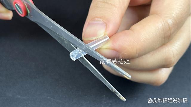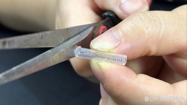 当它烧软后,我们再用剪刀按压一下,这样融化的塑料就会融合在一起,也就将笔芯的一端给堵住了。
