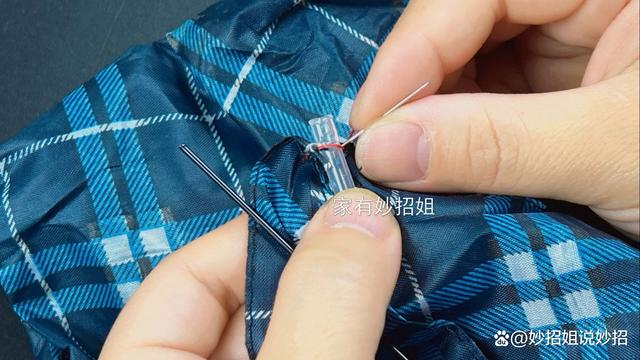 下面我们只需将制作好的伞珠固定在雨伞上就行。我们把伞珠放置在原本掉落伞珠的位置,然后用针线固定住。由于刚刚我们在笔芯上用剪刀按压了一点凹槽的位置,这样线固定在上方就会非常牢固,不用担心会滑落。我们尽量多缝制几圈,把制作好的伞珠固定住。